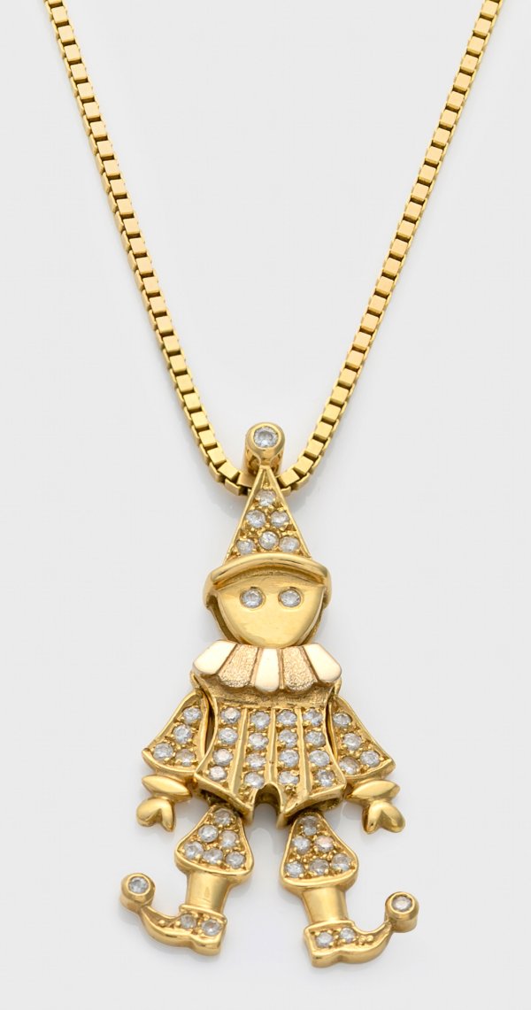 A long necklace with a harlequin pendant set with diamonds approx. 0,50 ct., in 18 k gold.