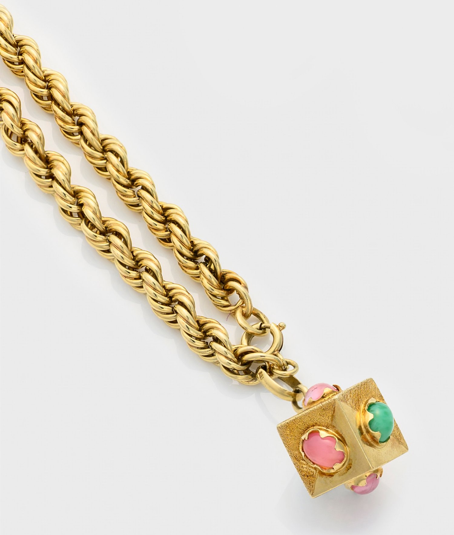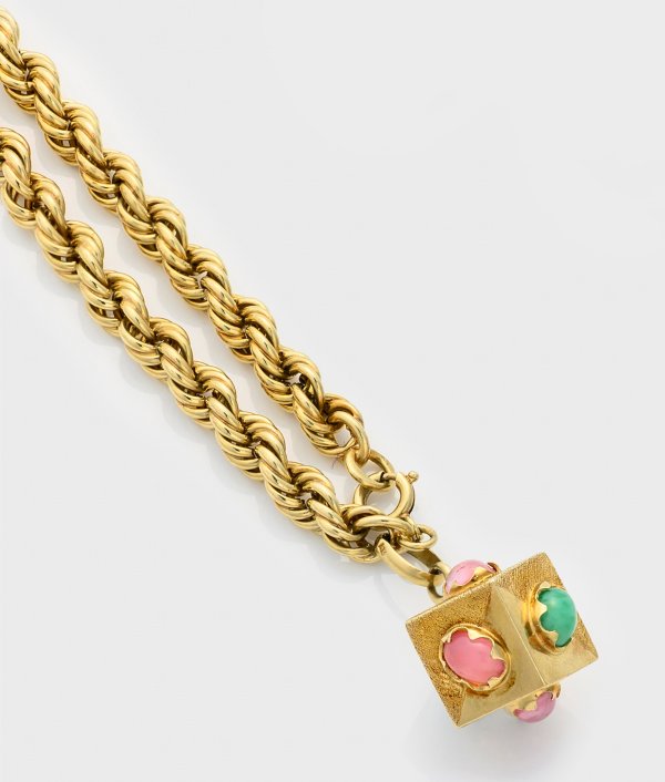 Gelbgold, gest. 585. Kordelband mit teils satiniertem Würfel, besetzt mit rosafarbenen Turmalin- sowie Türkis-Cabochons. Ges.-Gew. ca. 11,74 g.