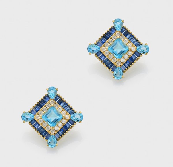 Pair of earrings set with sky blue topazes approx. 2,60 ct., sapphires approx. 1,70 ct. and diamonds approx. 0,44 ct.; in 18 k gold.