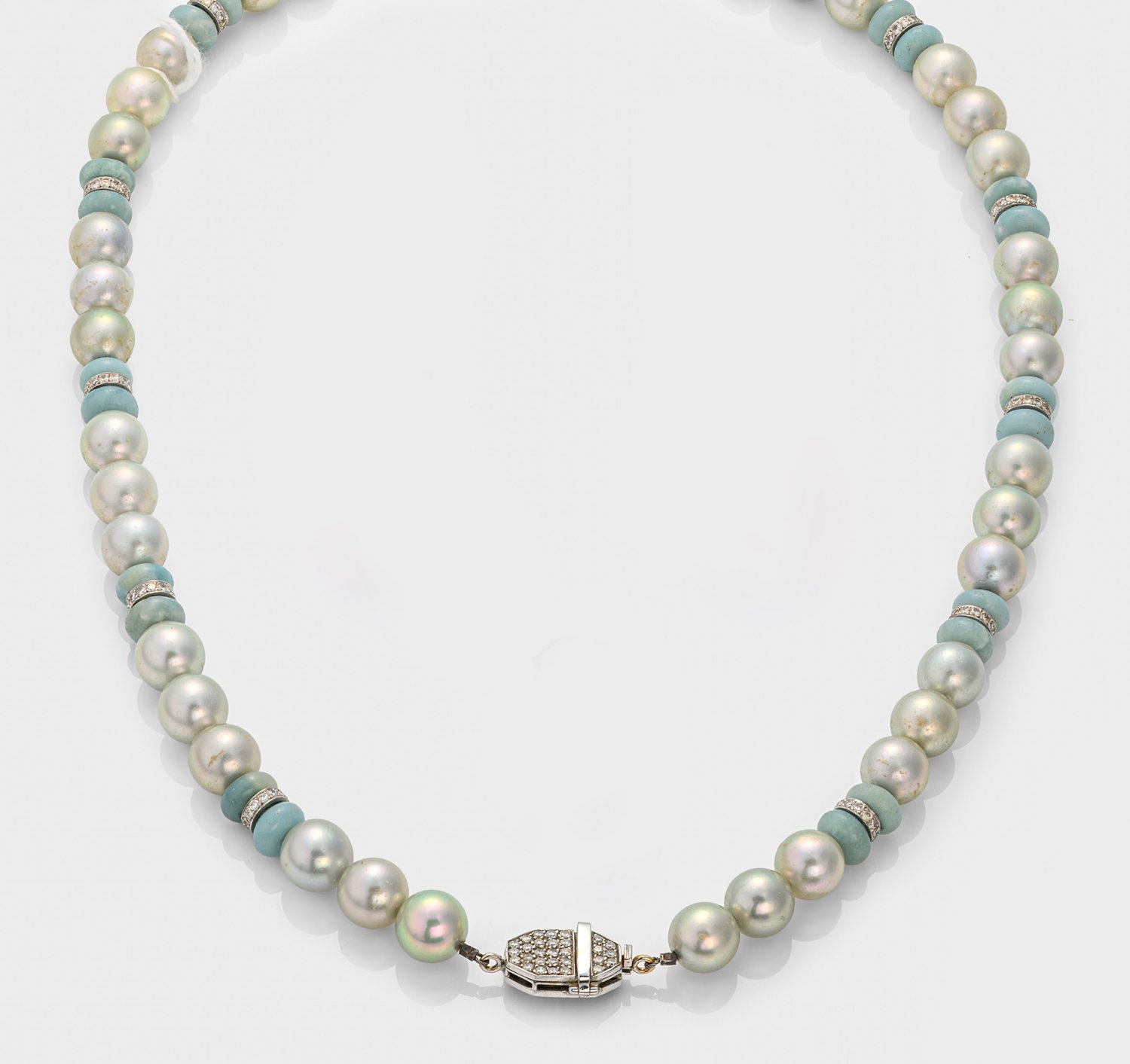 Weißgold, 18 ct.; Einreihige Kette aus hellgrauen Zuchtperlen von ca. 9 mm in sehr feinem, rosé-grün changierendem Lüster, unterteilt durch Diamantreifen und türkisfarbene Glasboutons. Schließe mit Brillantbesatz.