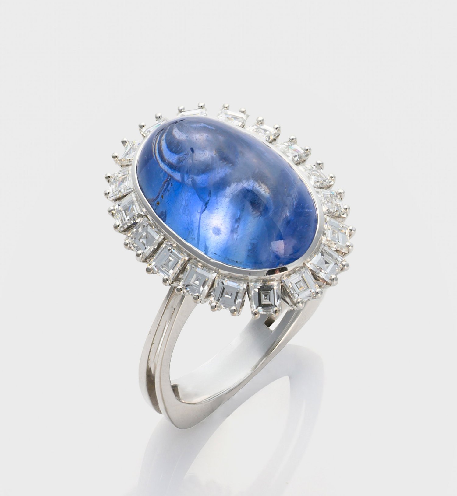 Weißgold, gest. 750. Zentral besetzt mit einem nahezu kornblumenblauen Saphircabochon von ca. 12,50 ct., entouriert von Diamanten von zus. ca. 1,50 ct. (G-H/vvs-vs) im Princesscut. Gew. ca. 8,49 g.