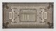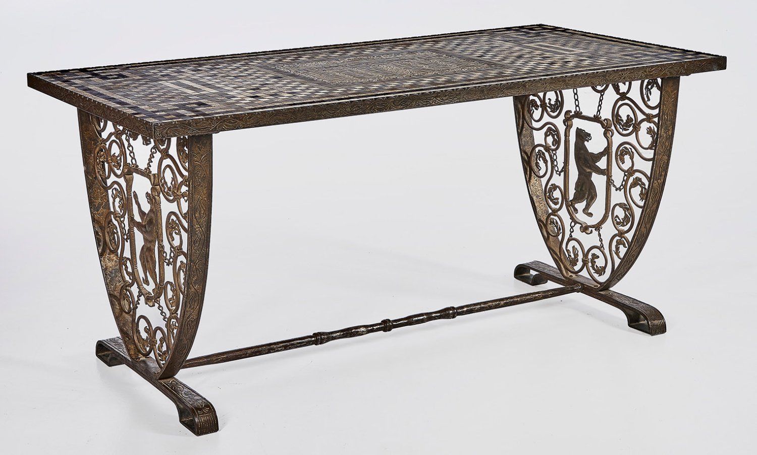 Schmiedeeisen, geschwärzt sowie kleine Fliesenquadrate in unterschiedlichen Grautönen, schwarz und weiß. Über flachen Kufen, durchbrochen gestaltete, schildförmige Seitenwangen aus zentraler Kartusche mit dem Berliner Bären, umgeben von üppigen, eingerollten Voluten. Rechteckige, profilgerahmte Deckplatte. In der Mitte zentrale Reserve mit der Darstellung des Brandenburger Tors, umgeben von Mäanderband. H. 67 cm. 141 cm x 71 cm.