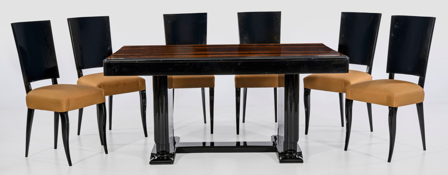 Holz, schwarz glänzend lackiert sowie Santospalisander, furniert. Über flach geschweiften Stufen, gekantete Seitenwangen als Träger für gerade Zarge und umlaufend profilierte Deckplatte. Trapezförmige Zarge auf geschweiften Beinen sowie hohe, rechteckige, leicht gewölbte Rückenlehnen. Sitzfläche gepolstert und bezogen. Rest.; Tisch-H. 74 cm. 160 cm x 100 cm. Sitz-H. 49 cm.