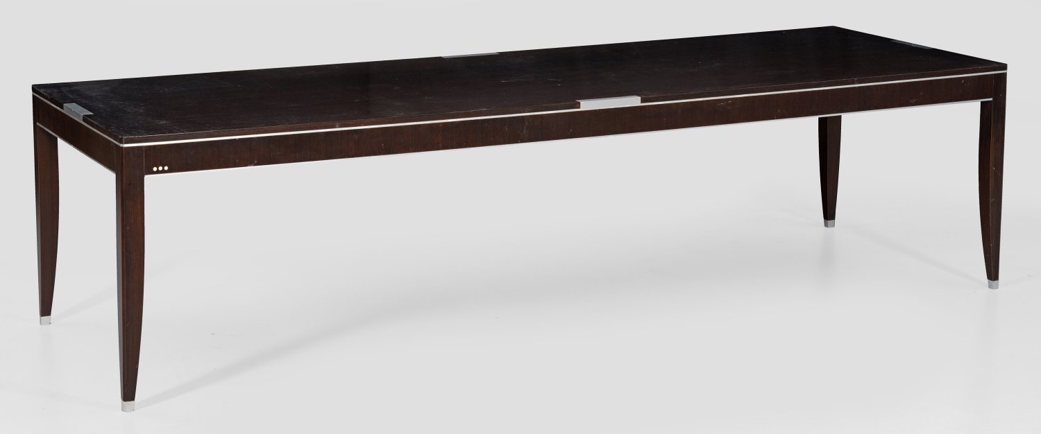 Makassar, furniert und dunkel gebeizt sowie Aluminium. Gerade Zarge auf gekanteten, konisch zulaufenden Beinen. Der Zarge entsprechende Deckplatte. Eingesetzte schmale Zierleisten und -reserven. H. 76 cm. 298 cm x 98 cm.