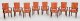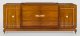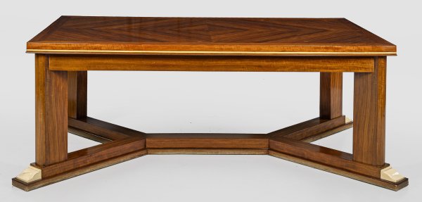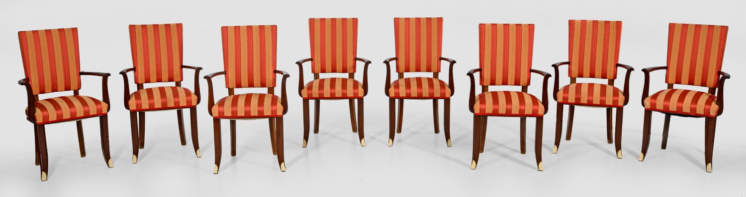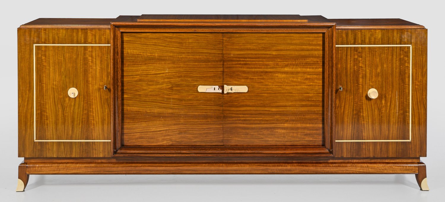 10-tlg.; Sideboard. Esstisch und acht Armlehnstühle. Rosenholz und Palisander, furniert sowie Einlagen und Applikationen aus cremefarbenem Bakelit. Querrechteckig angelegter Korpus auf leicht zurückgesetzter, gerundeter Zarge und geschweiften Füßen. In der gegliederten Front vier Türen unterschiedlicher Größe. Gestuft ansteigender oberer Abschluss. H. 101 cm. 245 cm x 54,5 cm; Gerade Zarge aus schräggestellten, gekanteten Beinen, unterhalb durch breite Stege verbunden; Bakelit teilw. besch.; H. 78 cm. 200 cm x 120 cm; Korrespondierende Armlehnstühle mit ausgestellten Beinen, schmalen Armlehnen und gewölbter Rückenlehne. Gepolstert und bezogen. Sitz-H. 48 cm.