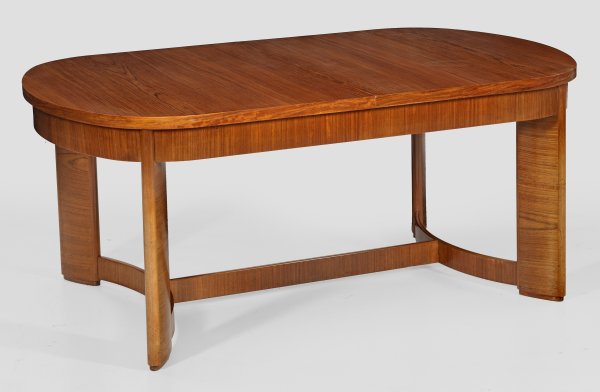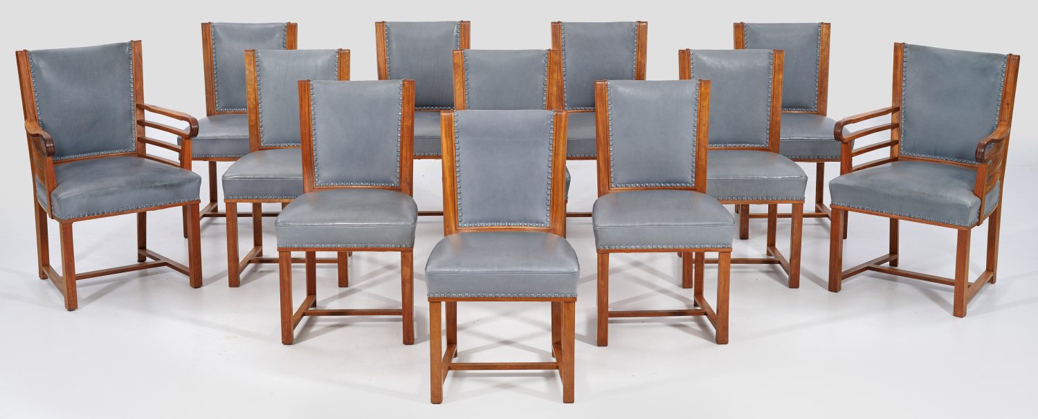 13-tlg.; Ausziehtisch, Paar Armlehnstühle und zehn Stühle. Rosenholz, massiv und furniert sowie taubenblaues Leder. Bombierte Zarge auf schräggestellten, gerundeten Beinen, unterhalb durch gebogte Stege verbunden. Gering überstehende Deckplatte. Dazu zwei unfurnierte erg. Einsteckplatten; Trapezförmige Zarge auf gekanteten Beinen. Gerundete Armlehnen sowie rechteckige, leicht gewölbte Rückenlehnen. Allseitig gepolstert und bezogen. Tisch-H. 74,5 cm. 110 cm x 175/291 cm. Sitz-H. 49 cm.