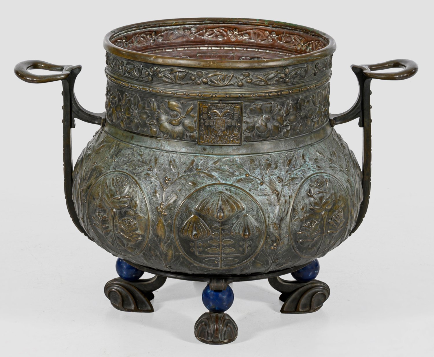 A Russian Art Nouveau bronze cachepot with lapis lazuli spheres on the feet and the state emblem of the Russian Empire.