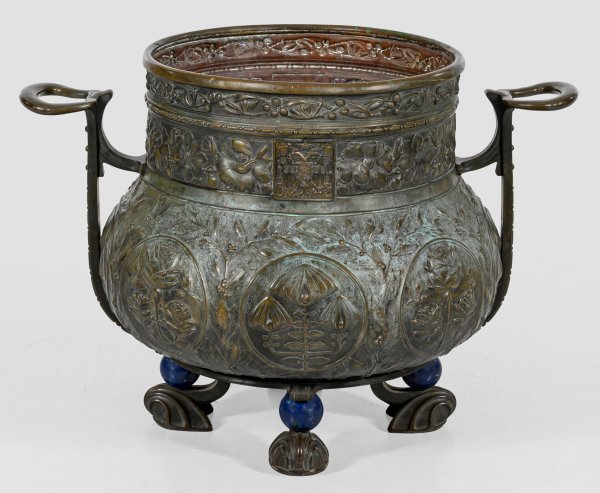 Bronze. Kesselförmig. Über vier vegetabil stilisierten und mit jeweils einer großen Lapislazuli-Kugel besetzten Füßen bauchiger, umlaufend reliefierter Korpus mit kurzem, zylinderförmigen Hals und mehrfach profiliertem Rand. Beidseitig in waagerechten Handhaben endende Griffe. Wandung mit acht runden, von Lorbeerzweigen umgebenen Kartuschen, abwechselnd gefüllt mit stilisierten Rosen und Mohnblumen. Schauseitig am Hals in rechteckiger Kartusche das Kleine Staatswappen des Russischen Kaiserreichs mit Doppeladler, auf dem zentralen Schild der Hl. Georg, seitlich je vier weitere Wappen. H. 65 cm. L. 90 cm.