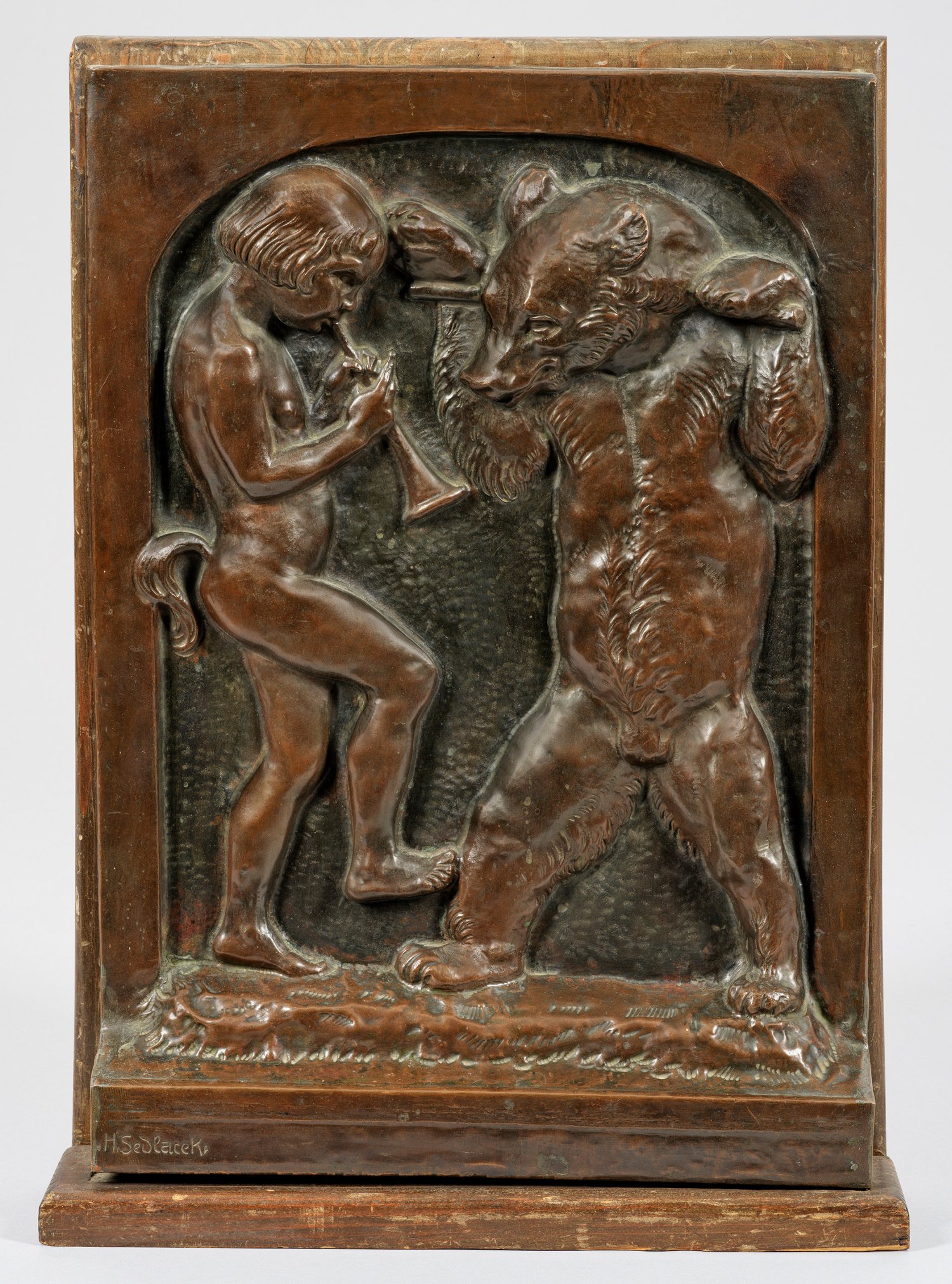 Patinated copper wall relief with young faun and dancing bear mounted on wooden board. Signed.