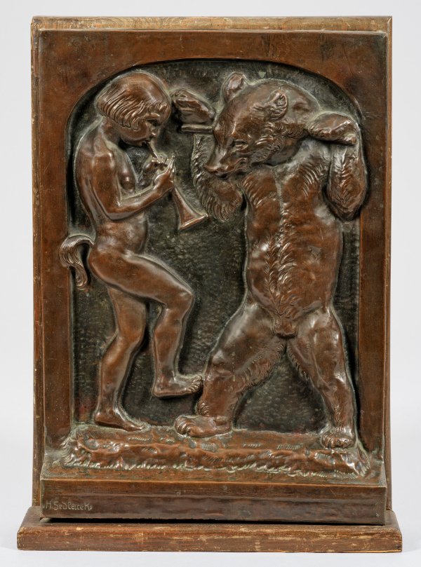 Jugendstil-Wandrelief mit Schalmei blasendem Faunsknaben und tanzendem Bären