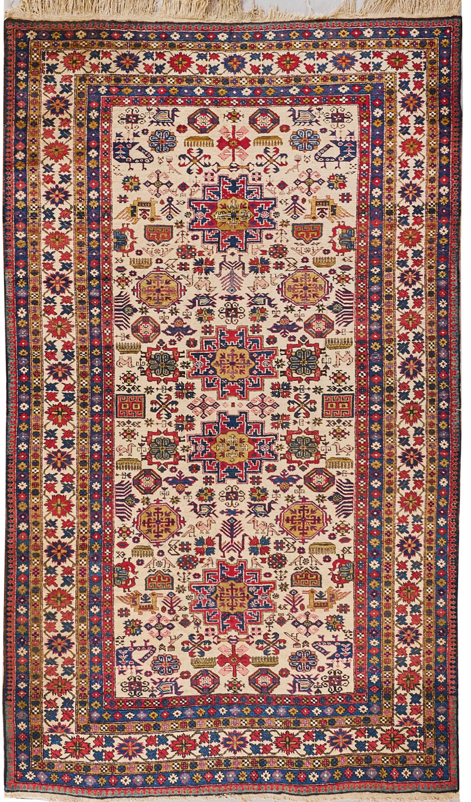 Wolle auf Baumwolle. Im elfenbeinfarbenen Innenfeld vier gereihte Medaillons sowie flächendeckende Musterung aus gestreuten Blütenmotiven. Umlaufend breite, vielteilige Bordüre aus unterschiedlichen Bändern. 160 cm x 273 cm.