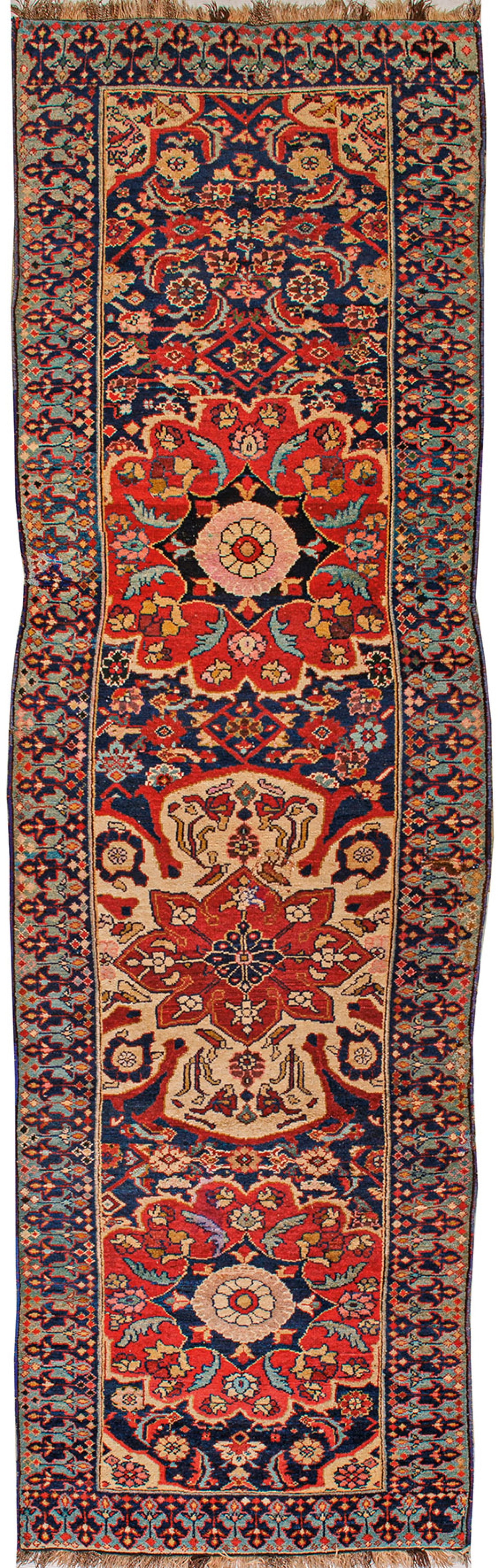 Kaukasus. Wolle auf Wolle. Im dunkelblauen Innenfeld drei große beige- bzw. rotgrundige Medaillons. Flächendeckende Musterung aus Blattwerk und Blütenrosetten. Umlaufend breite Ornamentbordüre. Rep.; 394 cm x 125 cm.