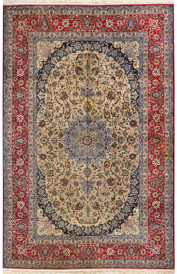 Persien. Korkwolle mit Seide auf Seide. Sehr feine Knüpfung. Im beigefarbenen, ovalen Innenfeld Zentralmedaillon mit Anhängern in hellblau. Flächendeckende Musterung aus arabesk angeordneten Palmettenranken. Umlaufend breite, hellrote Palmettenbordüre, flankiert von schmalen Bändern. 306 cm x 204 cm.