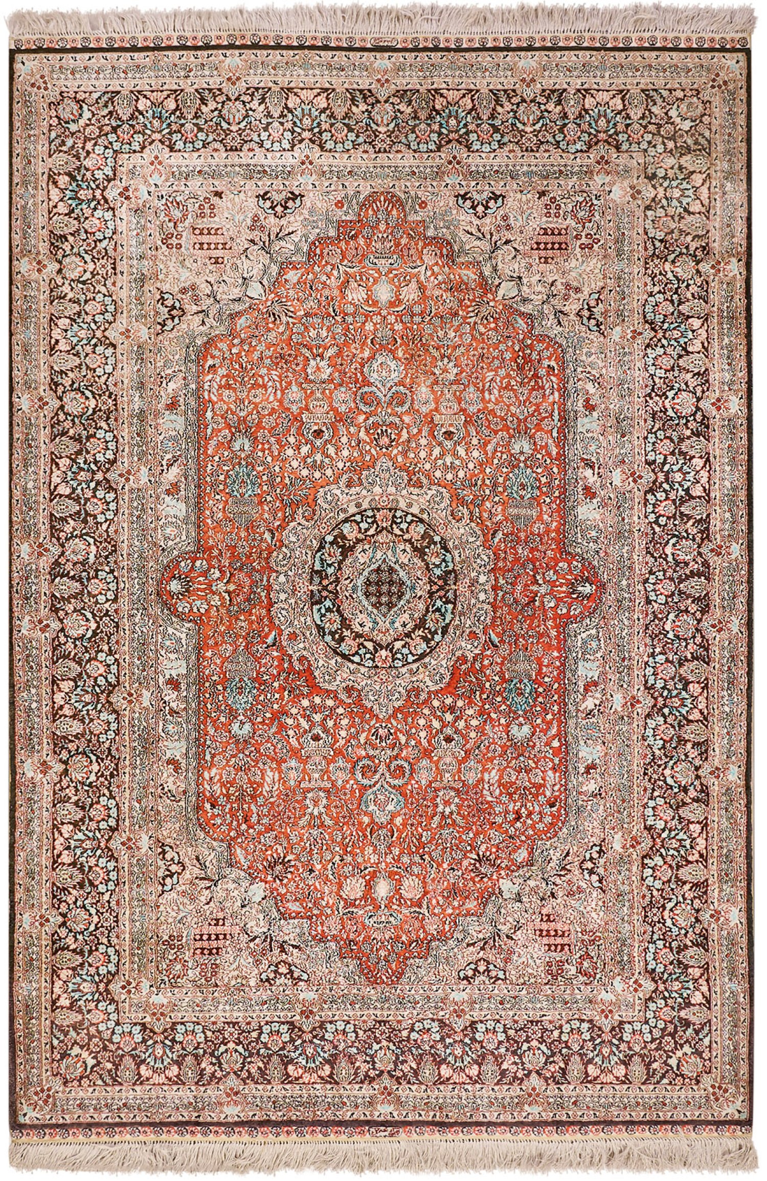 Seide auf Seide. Feine Knüpfung. Im hellroten, breit gerahmten Innenfeld zentrales Rundmedaillon. Flächendeckend dichte Musterung aus üppigen Blütenzweigen. Umlaufend breite, dunkelgrundige Bordüre mit korrespondierender Musterung. Sign.; 186 cm x 125 cm.