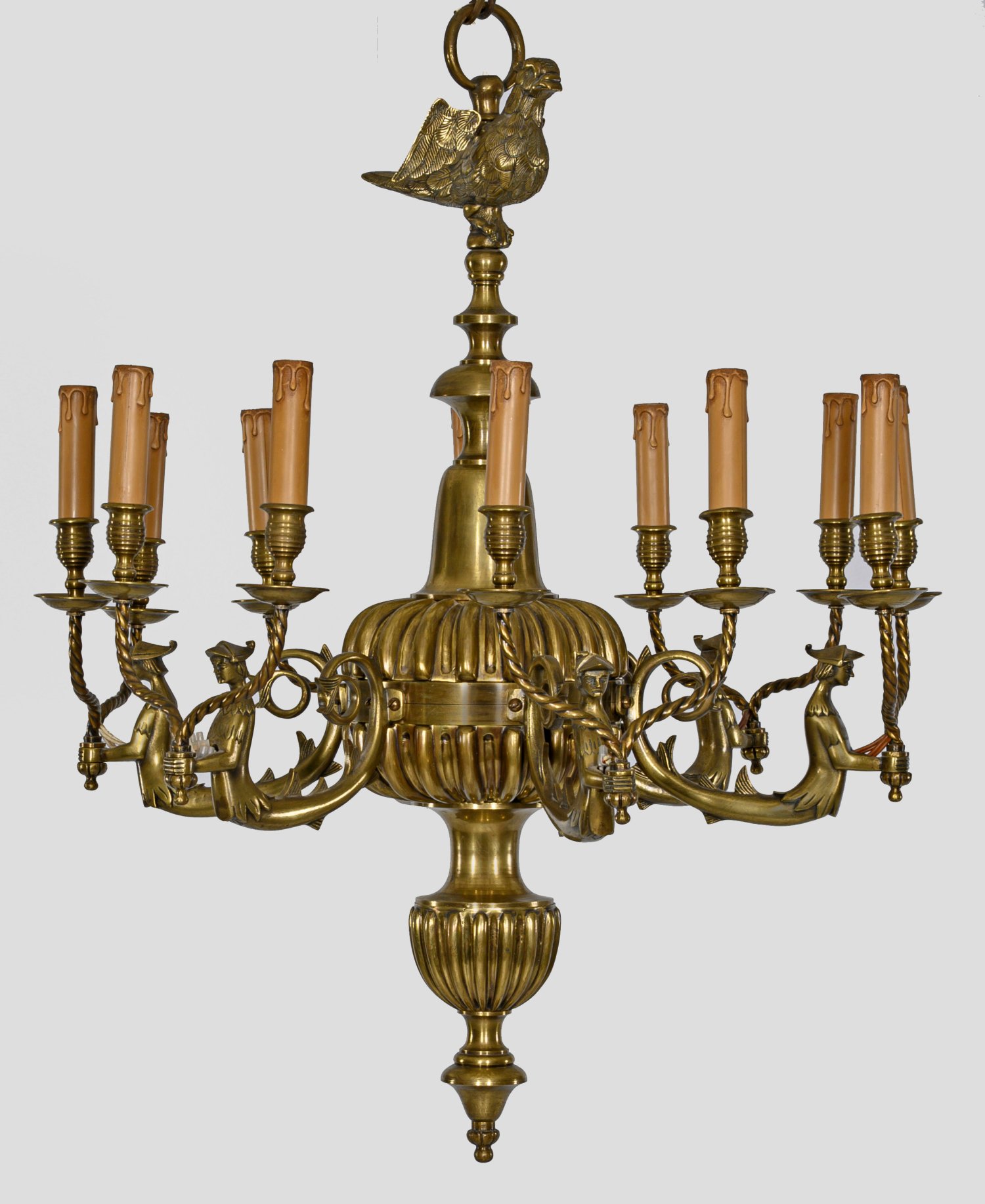 12-flg.; Messing. Kräftiger, mehrfach gegliederter und teilw. godronierter Balusterschaft mit plastischer Vogelbekrönung. Davon ausgehend stark geschwungene Leuchterarme aus Genien als Träger für paarweise angeordnete Leuchtmittel. Elektrifiziert. H. 85 cm. D. 65 cm.
