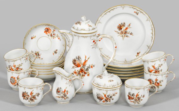 15-tlg.; Kaffeekanne, Milchkännchen, Zuckerdose, 6 Kaffeetassen mit Untertassen, 6 Dessertteller. Reliefdekor "Neuglatt". Asthenkel mit sich verzweigenden Blättern und Knospen, Deckelbekrönung mit plastischer Blüte. Im Spiegel und verstreut auf der Wandung Einzelblüten und Blumengebinde in orangefarbener Malerei mit Schwarzlot und Gold. Goldrand. Deckelbekrönung minim. best.; Zepter- und Malereimarke. Kannen-H. 25 cm.