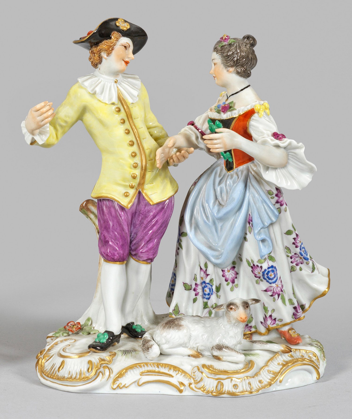 Auf einem mit Blättern und Blüten belegtem Rocaillesockel stehendes, liebkosendes Schäferpaar mit einem am Boden liegenden Schaf. Polychrome Malerei mit Goldstaffage. Modell-Nr. 61143. Best.; Ohne Schäferstab. Schwertermarke. H. 15,5 cm.
