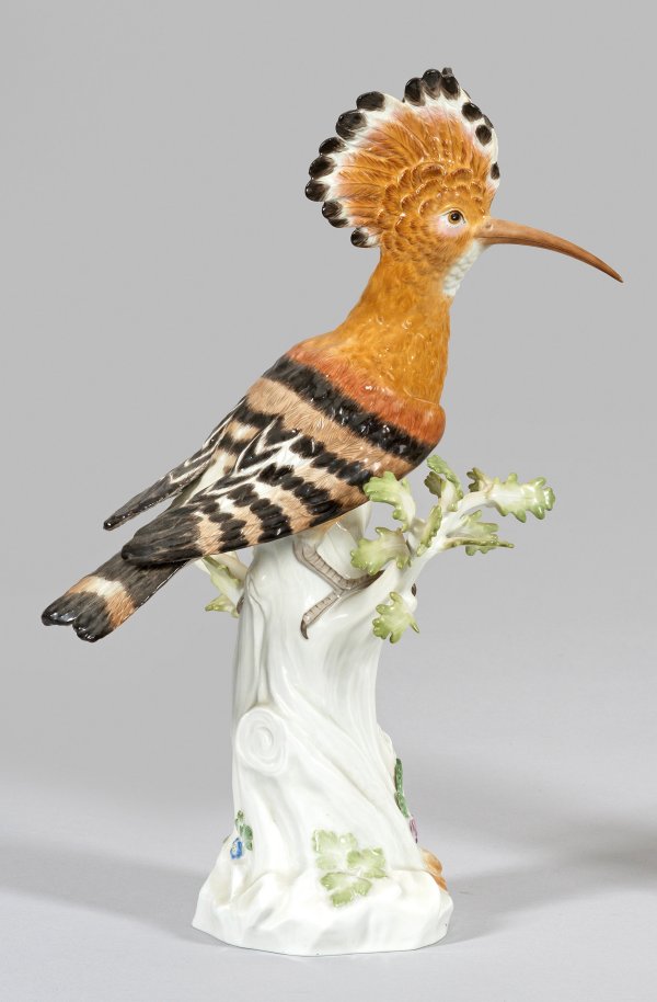 Auf Baumstumpfsockel mit Eichenblättern, teilw. plastischen Blatt- und Blütenbelag, sitzender Wiedehopf mit fein reliefiertem Gefieder und einer akzentuierten, aufgerichteten Federhaube sowie einem langen, gebogenen, spitzen Schnabel. Polychrome Malerei. Entw. Johann Joachim Kaendler und Johann Gottlieb Eder. Modell-Nr. 77072. Minim. rest.; Schwertermarke. H. 32,5 cm.