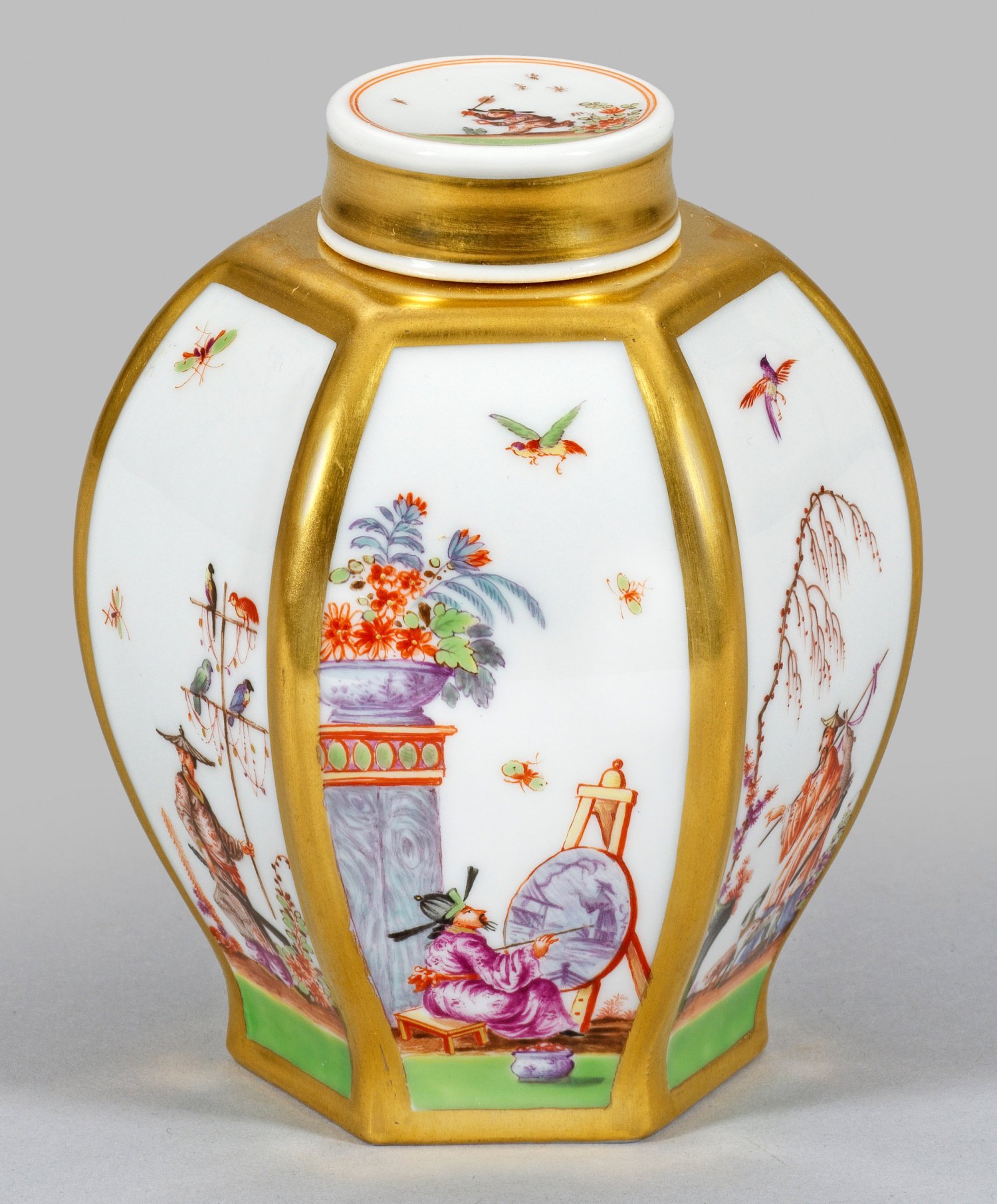 Balusterförmiger Korpus mit sechsfach profilgerahmter Wandung, kurzem Hals und flachem Deckel. In gitterartig goldgerahmten Reserven und auf dem Deckel unterschiedliche szenische Darstellungen von Chinesen in blühender Gartenlandschaft, u.a. bei der Teezeremonie, als malender Künstler bzw. mit Vögeln und mit Tieren, sog. Chinoiserien. Feine polychrome Malerei mit Glanzgoldstaffage. Modell-Nr. 52867. Schwertermarke. H. 12,5 cm.