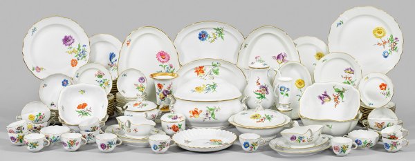 für 12 Personen, 103-tlg.; Kaffeekanne und 12 -tassen mit Untertassen, Zuckerdose, Kuchen- und Gebäckschale, 12 Brot-, 12 Kuchen-, 12 Dessert-, 12 Speise- und 12 Suppenteller, 8 Suppentassen mit Untertassen, kleine und große Terrine, Gemüsenapf, 2 Saucieren. 2 runde-, 4 eckige- und 6 ovale Beilagenschalen, 2 Vasen. Auf der Wandung und im Spiegel farbenprächtiger Blumendekor in polychromer Malerei. Goldstaffage. 5 Objekte minim. best.; Schwertermarke. Kannen-H. 26 cm. Platten-L. 42 cm.