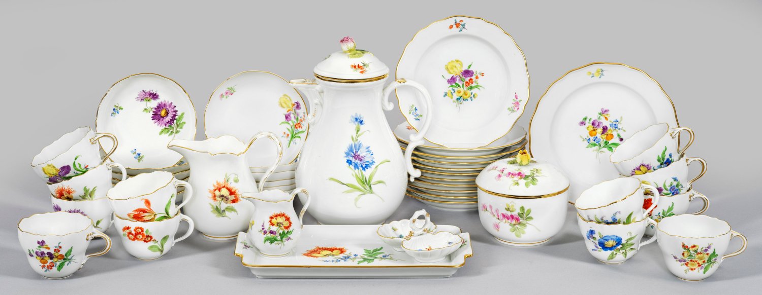 30-tlg.; Kaffeekanne, Zuckerdose, kleiner und großer Sahnegießer, 12 Tassen mit Untertassen, 11 Kuchenteller, Dessertteller, Saliere, Tablett. Auf der Wandung und im Spiegel farbenprächtiger Blumendekor in polychromer Malerei. Goldstaffage. Gold teilw. minim. ber; Kanne und Zuckerdose minim. best.; Sahnegießer mit Haarriss. Schwertermarke. Kannen-H. 25,5 cm.