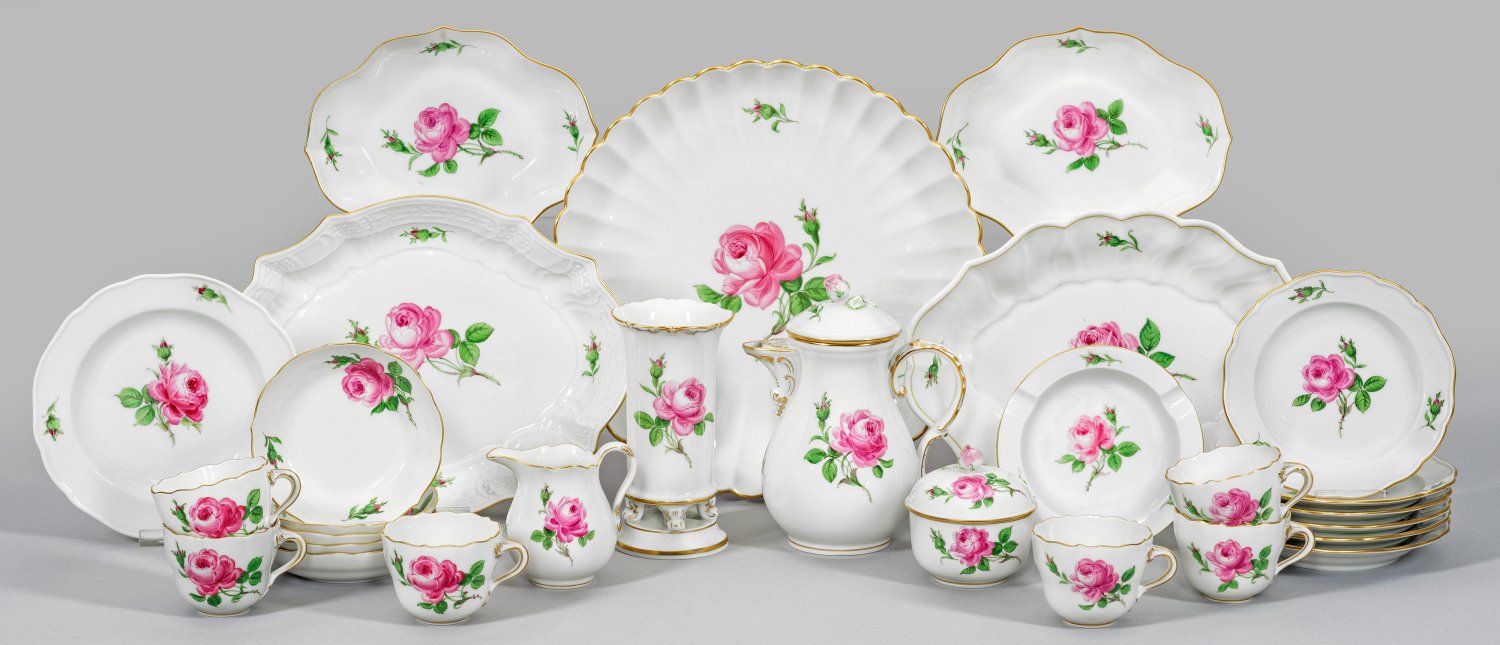 für mindestens 6 Personen, 23-tlg.; Überwiegend Form "Neuer Ausschnitt". Mokkakanne, Zuckerdose, Milchkännchen, 6 Mokkatassen mit Untertassen, 6 Dessertteller, Füßchenvase, Aschenbecher, Kuchenteller, Fächerschale, zwei Vierpassschälchen, Servierschale mit olivgrüner Kontur und Servierschale mit "Neubrandenstein"-Reliefdekor. Im Spiegel und auf der Fahne Dekor aus blühenden und knospenden Rosen in polychromer Malerei. Zumeist Goldrand. Eine Untertasse fehlt. Teilw. äußerst minim. best.; Schwertermarke. Kannen-H. 16 cm. Tassen-H. 5 cm.