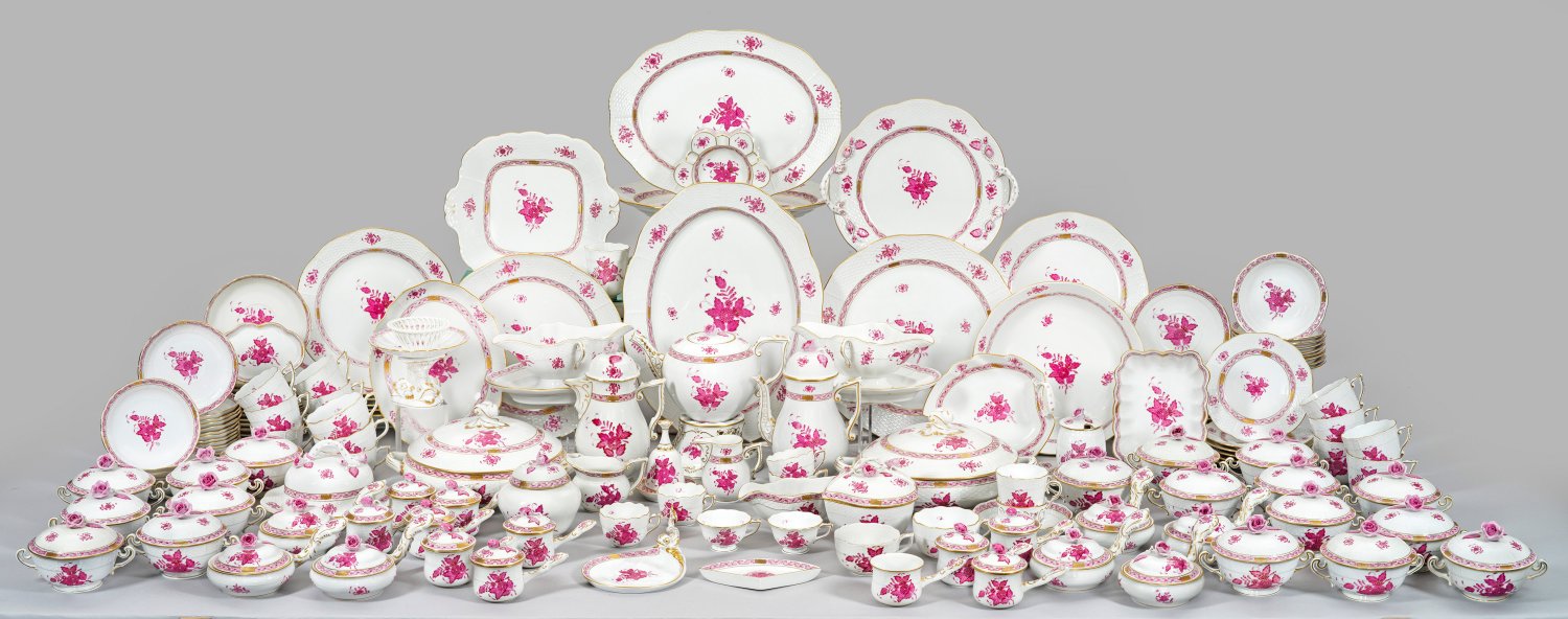 116-tlg.; Tee- und 2 Mokkakannen, 2 Sahnegießer, 2 Zuckerdosen, Stövchen, 11 Schokoladen- mit 13 Untertassen, 11 Kaffee- mit 9 Untertassen, 5 Tee- mit Untertassen, 6 Mokkatassen, 2 Zittertassen mit 1 Untertasse, 18 Suppen- mit 26 Untertassen, Blatt-, Dreiecks und Fußschale, 3 Konfektschalen, 2 Terrinen, 3 Saucieren, Beilagenschale, Bratenplatte, 2 runde-, 3 ovale Anbietplatten, 10 Speise-, 6 Suppen- und 6 Brotteller, 7 Butterpfannen, Butterdose, Senftöpfchen, 2 Tabletts, Visitenkartenschale, Aschenbecher, Glocke auf Unterteller. "Ozier"-Relief mit Indianischem Dekor, sog. "Apponyi Purpur" in Aufglasur mit Goldstaffage. Teilw. minim. best./ber.; 2 Haarrisse. Manufakturmarke. Kannen-H. 14 cm - 21 cm. Bratenplatten-L. 41 cm.