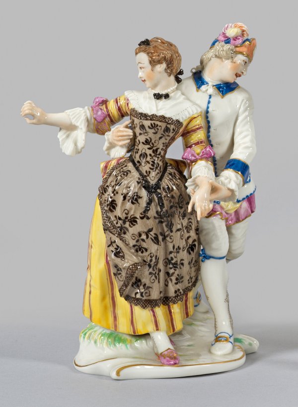 bzw. "Botengänger mit Mädchen". Auf flachem Rocaillesockel stehender Bote in traditioneller Uniform, mit dem Arm die Hüfte der Dame im Kleid eng umschließend und ihre Hand haltend. Polychrome Malerei mit Goldkonturierung. Entw. Franz Anton Bustelli. Modell-Nr. 549. Gepresste Manufakturmarke. H. 17,5 cm.