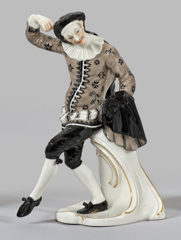 Auf Rocaillesockel, in Tanzschritt stehender Komödiant in blumig gemustertem, grauem Wams und schwarzer Hose, seinen Umhang im linken Arm haltend. Polychrome Malerei mit Goldstaffage. Entw. Franz Anton Bustelli, 1759/60. Manufakturmarke. H. 19,5 cm.