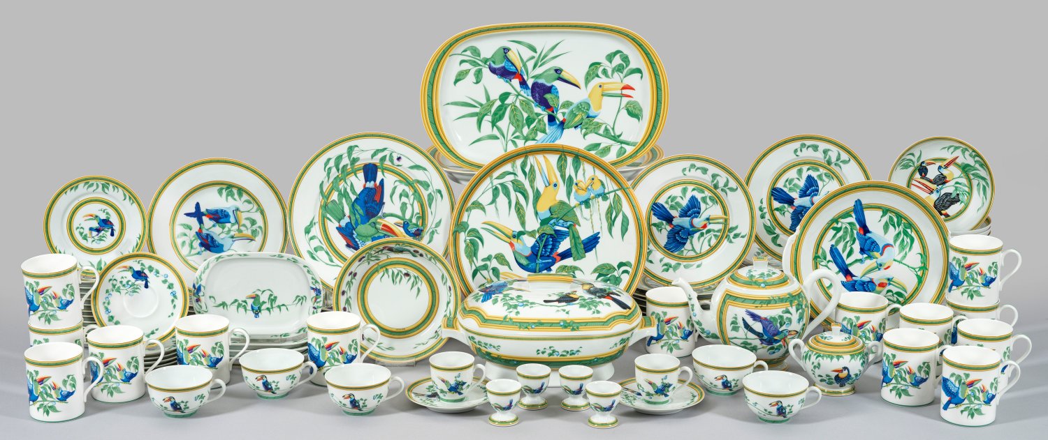 80-tlg.; Terrine, 5 Speise-, 17 Vorspeisen-, 4 Suppen-, 13 Brotteller, 4 Salat-, 4 Butter-, Gebäck- und Henkelschale, 2 Anbietplatten, Tortenplatte, 4 Eier-, 14 Kaffeebecher, Kanne, Zuckerdose, 2 Mokka-, 5 Teetassen mit 2 bzw. 6 Untertassen. Farbenprächtiger Dekor mit Tukanen. Bez. "HERMÈS". Teilw. ber.; 4 Objekte minim. best.; 2 mit Haarriss. Firmen- und Manufakturmarke. Teller-D. 16 cm - 27 cm. Anbietplatten 39,5 cm x 24,5 cm.