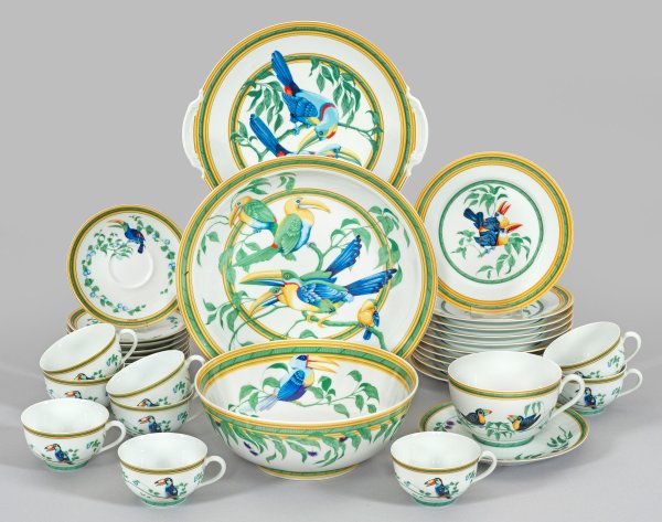 23-tlg.; Anbiet- und Beilagenschale, Kuchentablett und 10 -teller, 9 Teetassen und eine große Café au lait-Tasse mit Untertassen. Farbenprächtiger Dekor mit Tukanen. Bez. "HERMÈS". Firmen- und Manufakturmarke. D. 9,5 cm – 29,5 cm.