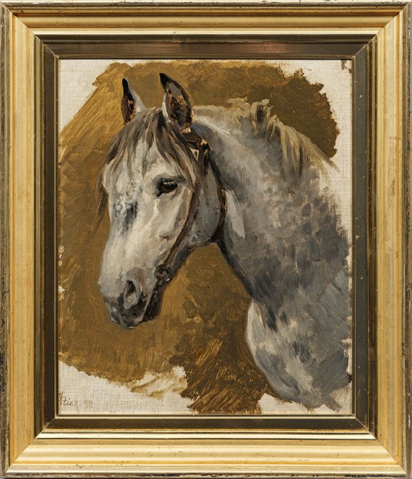 Vor spärlich braun-grün staffiertem Hintergrund die mit lockerem, dynamischen Duktus gemalte, naturgetreue Darstellung eines Schimmels. Zick, Sohn des Gustav und Urenkel des Januarius Zick, besuchte die Düsseldorfer Akademie als Schüler von Eduard Bendemann und ging 1880 auf Veranlassung Ludwig Knaus' nach Berlin. Neben Illustrationen für zahlreiche renommierte Verlage schuf Zick überwiegend Genre- und Historiengemälde. Öl/Lwd., kaschiert auf Karton. L. u. sign. u. dat. (18)94. Sichtmaß 34 cm x 28,5 cm. Rahmen.