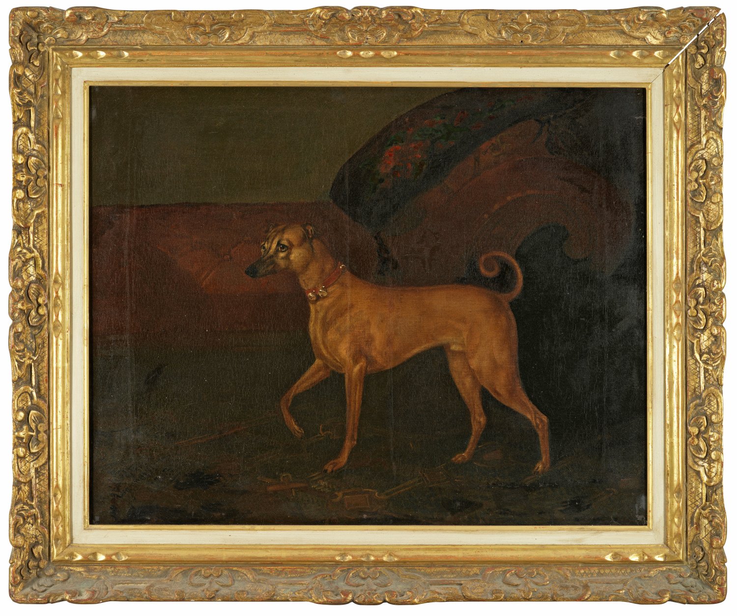 In einem Interieur mit Récamiere und Perserteppich der elegante Whippet mit erhobener Vorderpfote und feinem Lederhalsband. Subtil charakterisiertes Bildnis des englischen Tiermalers Harrowing, bekannt vor allem für seine Gemälde von Hunden und Pferden. Öl/Lwd. L. u. sign. und dat. 1883. 58,5 cm x 71,5 cm. Rahmen.