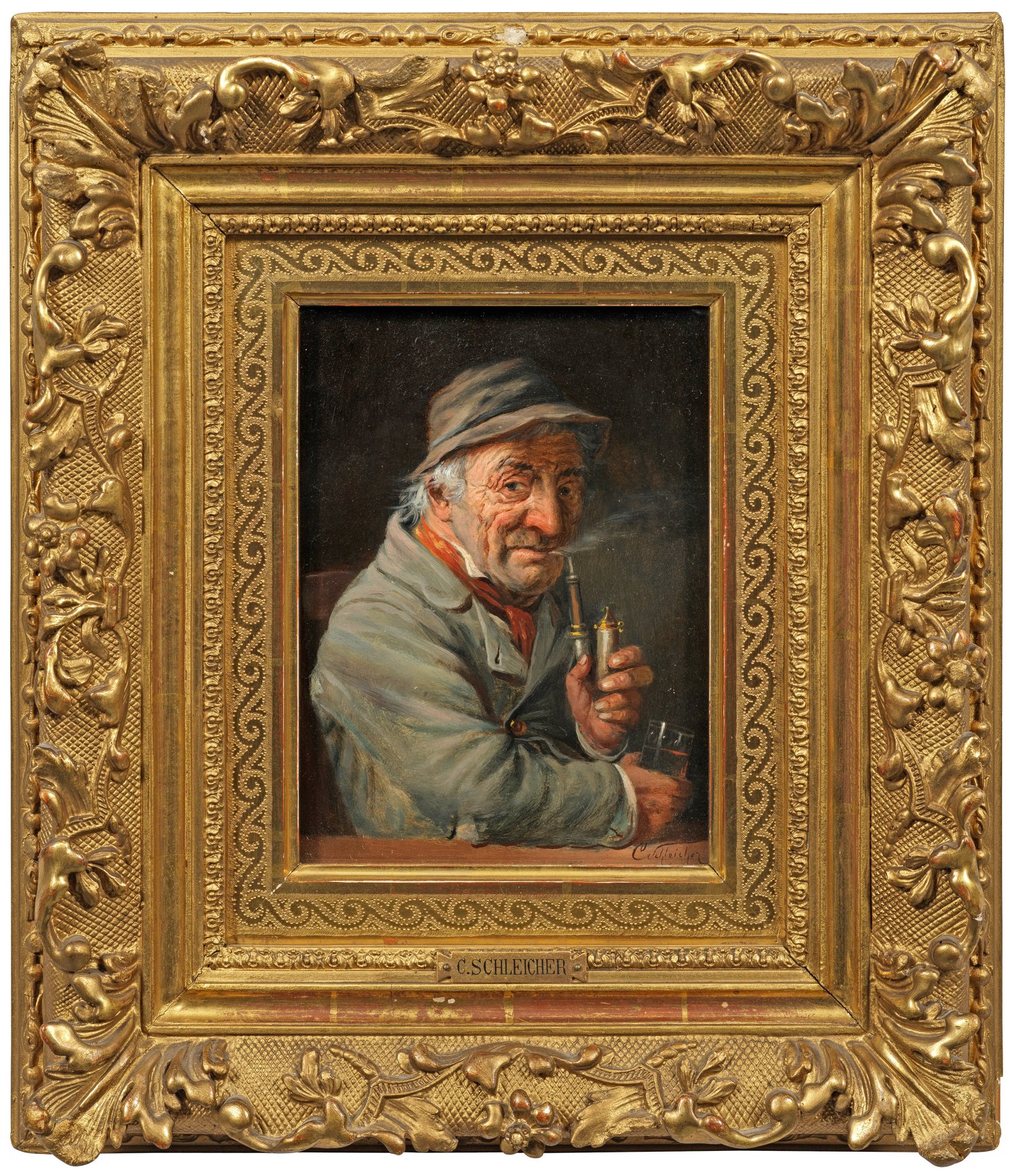 Feinmalerisch ausgeführtes Charakterbildnis. Hauptsujets Schleichers waren Einzel- und Gruppenporträts älterer Männer, weiser Juden, Rabbiner, Talmudgelehrter und Mönche, die er sympathisch schilderte. Der Maler war vermutlich ein Waldmüller-Schüler; 1859 bis nach 1871 in Wien ansässig, stellte er dort u. a. im Österreichischen Kunstverein aus. Öl/Holztafel. R. u. sign.; 21 cm x 15,5 cm. Original-Rahmen.