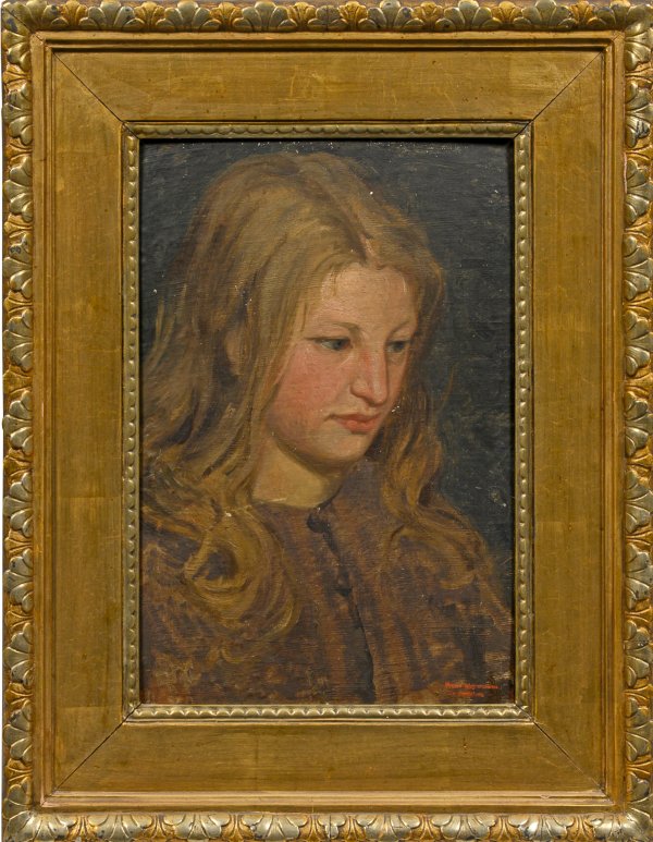Vermutlich als Studie geschaffenes Bildnis Meyerheims, der aus einer bedeutenden Künstlerfamilie stammte. Seinen ersten künstlerischen Unterricht bekam Meyerheim durch seinen Vater Friedrich Eduard Meyerheim, schon mit 16 Jahren ging er 1854 an die Kunstakademie seiner Heimatstadt und wechselte vier Jahre später an die Kunstakademie Düsseldorf. Neben Hessen und Tirol bereiste Meyerheim auch Belgien, Italien und die Schweiz. Öl/Lwd., kaschiert auf Karton. R. u. Stempelsignatur in Rot. Verso Etikett sowie handschriftl. (Werk-)Nr. 246 (zweifach). 43,2 cm x 29,3 cm. Rahmen.