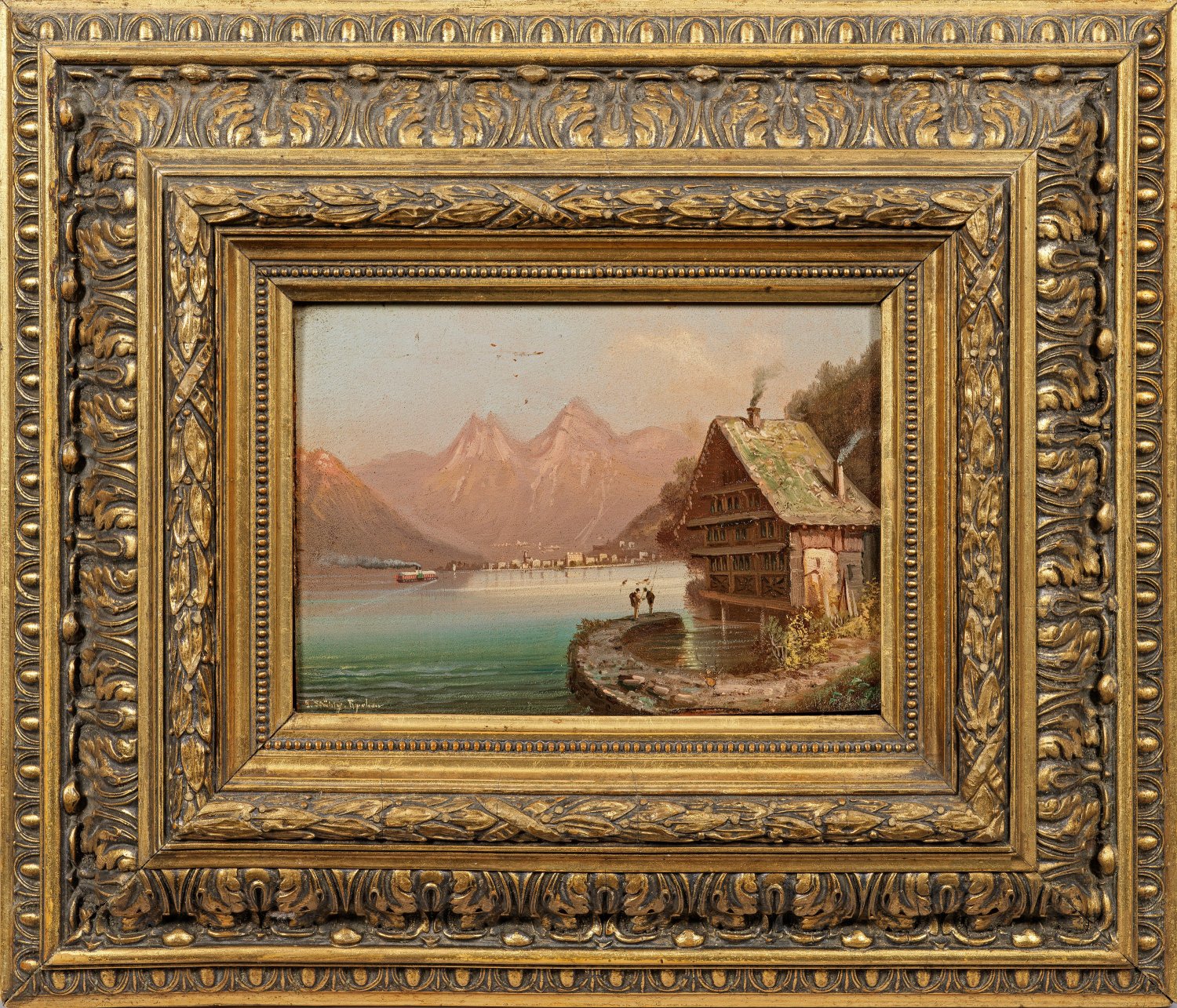 Atmosphärisch gestimmte, fein gemalte Vedute. Der zunächst in Bern, Bollingen und Langenthal tätige, seit 1895 in Thun ansässige Landschafts- und Vedutenmaler widmete sich, außer wenigen Motiven aus Österreich, vornehmlich Veduten aus der Schweiz und seinen Alpen. Öl/Holztafel. L. u. sign.; 11,2 cm x 16 cm. Rahmen.