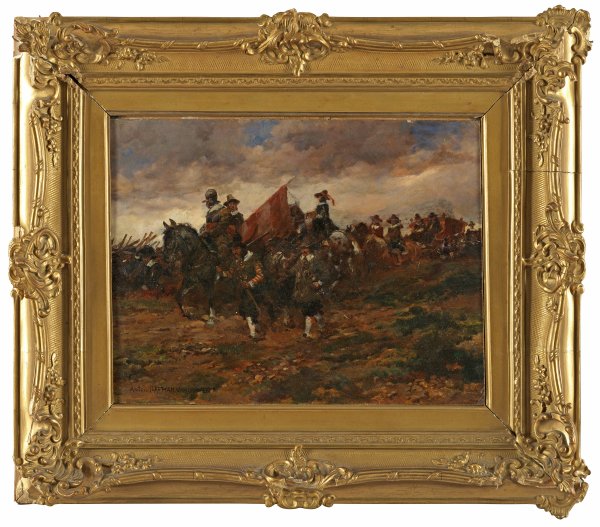 Motiv- und stiltypisches Werk des 1889-95 an der Münchener Kunstakademie bei Gabriel von Hackl und Wilhelm von Diez ausgebildeten Malers, der sich auf die Historien- und Militärmalerei spezialisierte und seit 1896 im Glaspalast ausstellte. Öl/Malkarton. L. u. sign. mit Ortsangabe München. 23 cm x 31 cm. Rahmen.
