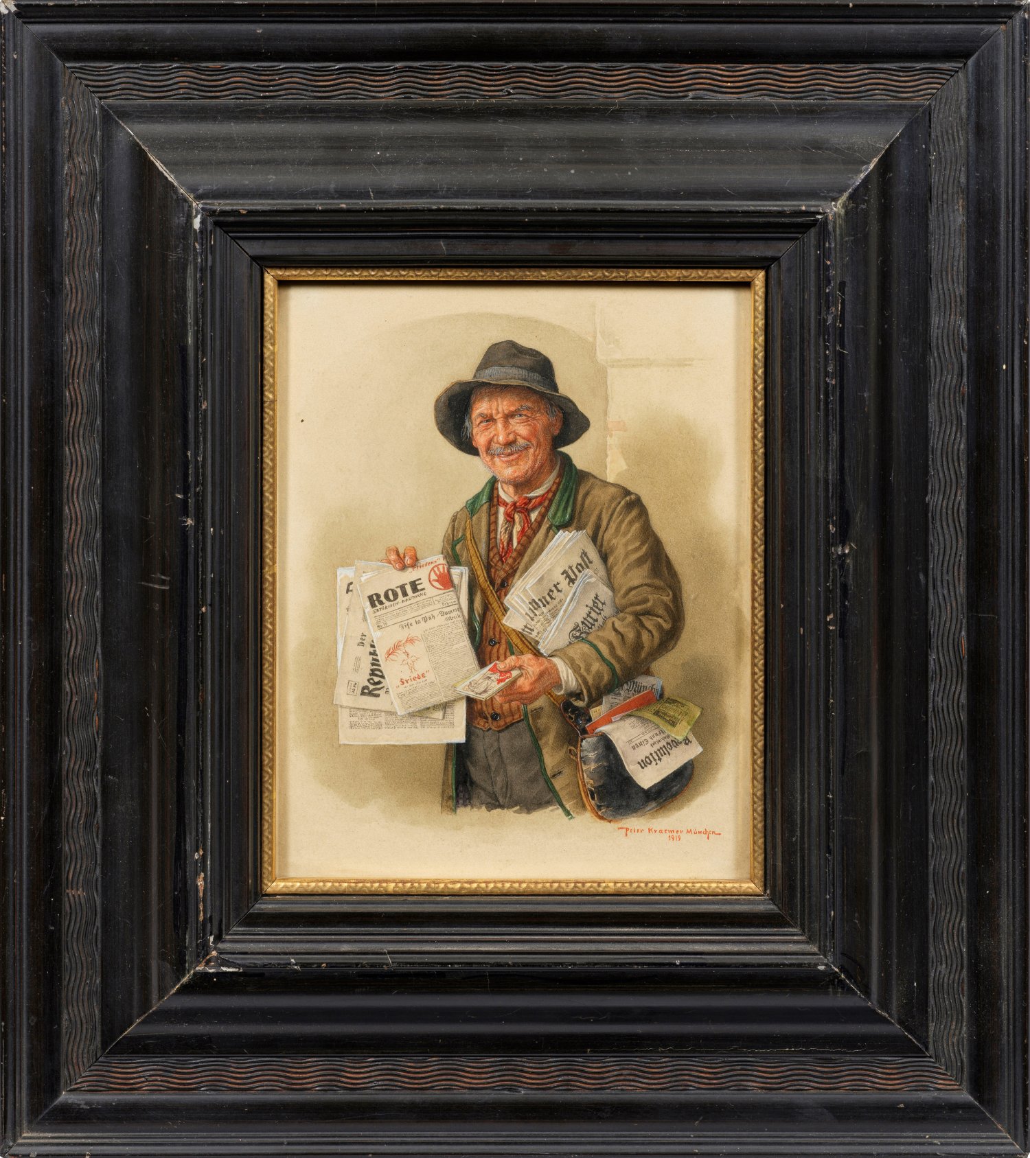 Minutiös fein gemaltes, motiv- und stiltyipisches Werk Kraemers mit eindrucksvoller Figurencharakterisierung des Zeitungsverkäufers, der hier u. a. die (von Dezember 1918 bis August 1922 erscheinende) satirische Wochenschrift "Rote Hand" anbietet. Aquarell u. Gouache/Papier. R. u. sign. mit Ortsangabe München u. Dat. 1919. Ca. 22 cm x 18 cm. Rahmen.