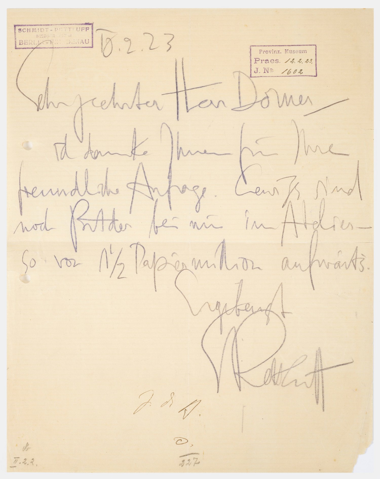 Einseitig, handschriftlich beschrieben, sign. und dat. "10.2.23". Kopierstift. L. o. Absenderstempel, r. o. Museumsstempel und nummeriert. Der deutsche Maler und Grafiker Karl Schmidt-Rottluff (1884-1976) bezieht sich in seinem Schreiben mit leicht spottender Art auf eine Anfrage eines Museumsleiters "... danke Ihnen für Ihre freundliche Anfrage. Gewiss sind noch Bilder bei mir im Atelier - so von 1 1/2 Papiermillion aufwärts...". Gefaltet und gelocht. Minim. besch.; 27,8 cm x 21,9 cm.