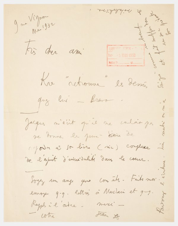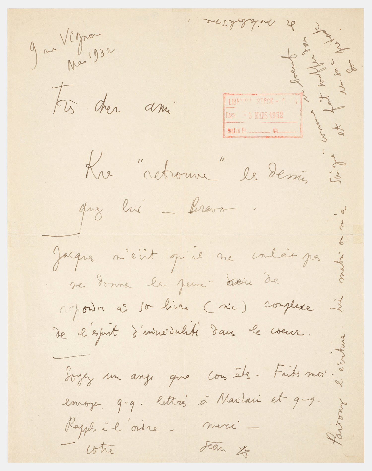 Einseitig, handschriftlich beschrieben, sign. und dat. "9 rue Vignon Mars 1932". R. o. Eingangsstempel der "Libraire Stock" in Paris vom 5. Mai 1932. "... cher ami Kre "retrouve" les dessins chez lui- Bravo. Jacques m'écrit qu'il ne voilait pas me donner la peine de repondre à son livre... Soyez un ange que vous etes. Faites moi envoyer q-q- lettres à mailain... Pardonnez l'écriture...". Minim. rep.; 27 cm x 21 cm.