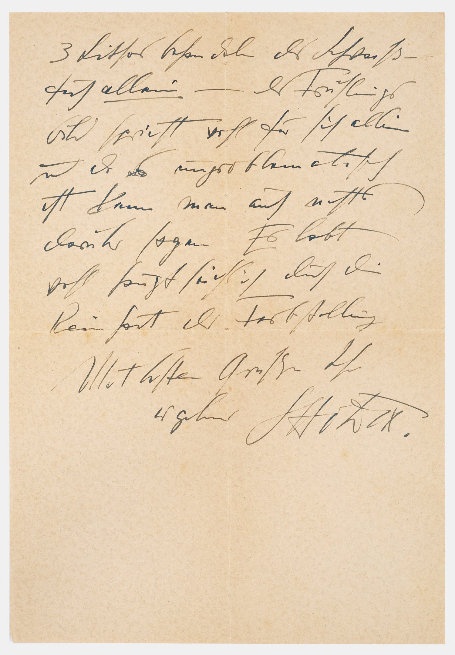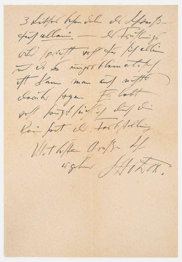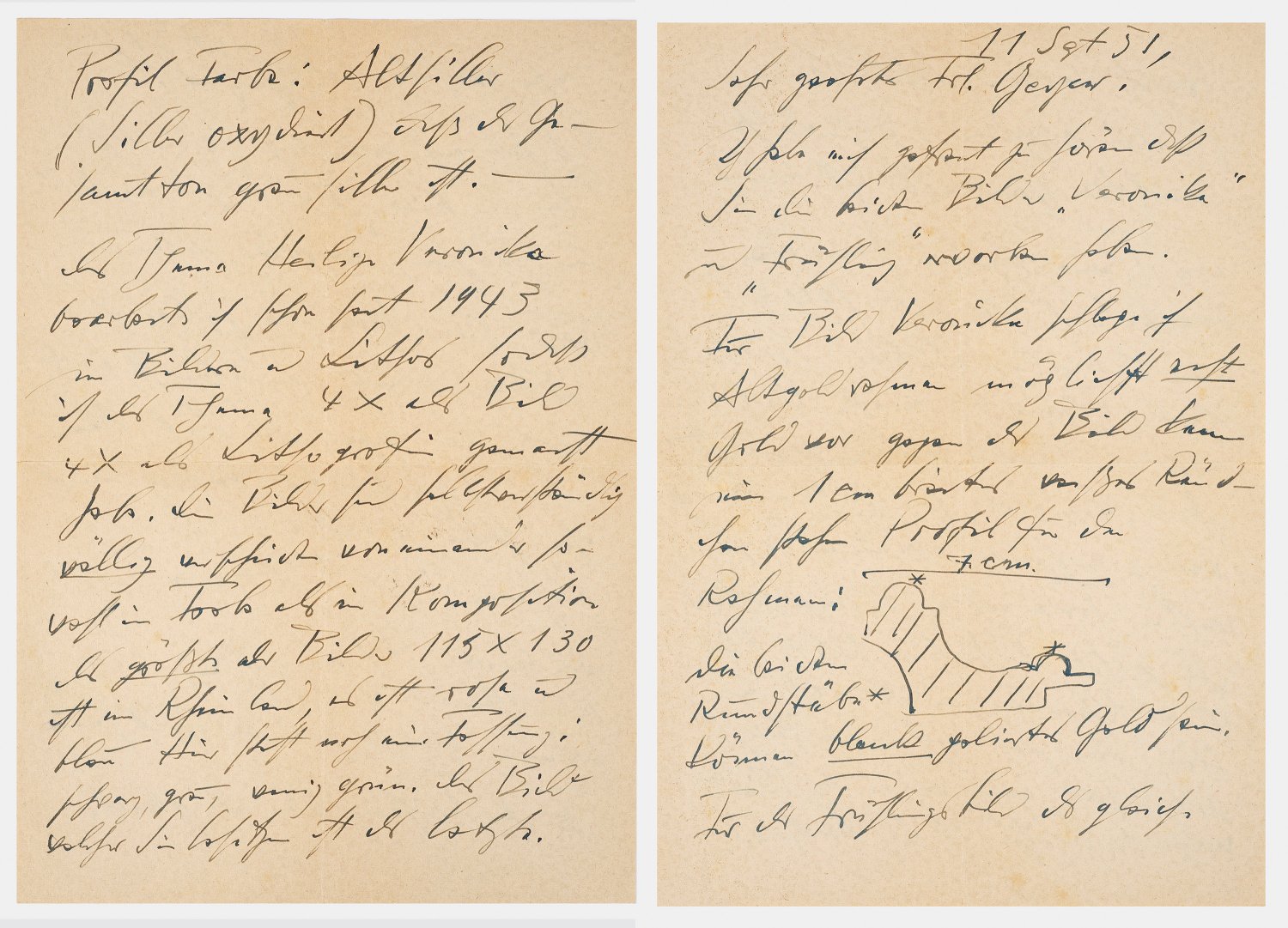 Zwei Blätter, gefaltet. Eines zweiseitig, das andere einseitig, handschriftlich beschrieben, sign. und dat. "11. Spt. 51". Der deutsche Maler und Grafiker Otto Dix (1891-1969) wendet sich in seinem Schreiben mit Rahmungsempfehlungen und eigenhändiger Skizze eines Leistenprofils zu zwei seiner eigenen Werken an Elisabeth, Tochter seines befreundeten Kollegen Wilhelm Geyer (1900-1968) "...Ich habe mich gefreut das Sie die beiden Bilder "Veronika" und "Frühling" erworben haben. Für Bild Veronika schlage ich Altgoldrahmen, möglichst echt Gold vor...Für das Frühlingsbild das gleiche Profil: Altsilber (Silber oxydiert) daß der Gesamtton grausilber ist. Das Thema Heilige Veronika bearbeite ich schon seit 1943 in Bildern und Lithos... Die Bilder sind selbstverständlich völlig verschieden voneinander sowohl in Farbe als in Komposition.". Gefaltet. 29,2 cm x 20,8 cm.