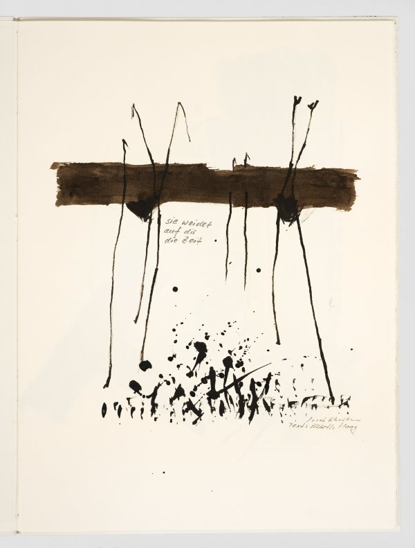 Mit seinen Arbeiten steht Ebnöther in einer Tradition mit dem Abstrakten Expressionismus, dem Informel und Tachismus. Tusche, Mischtechnik u. Bleistift/Bütten, 2007. 5 eingebundene Blätter mit zusätzlicher Arbeit auf dem Einbanddeckel. Jedes Blatt sign. u. bez. "Josef Ebnöther (/) Text: Elsbeth Maag". auf dem Einband-Innendeckel hinten bez. "Bild Josef Ebnöther, CH9450 Altstätten (7) Text Elsbeth Maag, CH-9470 Buchs () Herbst 2007. Original Karton-Einband. Buch ca. 38,5 cm x 28,8 cm.