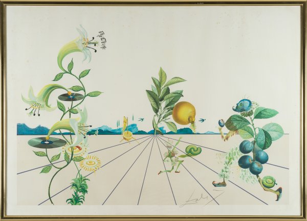 Farblithographie u. Prägedruck/Arches-Velin, 1981. Im Stein sign.; Verso Editionsstempel mit Nummerierung 4104/4880. Angefertigt nach einer Collage des Künstlers, die er speziell für die Edition anfertigte. Druck bei Matthieu, Zürich. Hrsg. Art Inter Senans, Bern. Wvz. Michler/Löpsinger 1586. Stockfleckig. Darstellung ca. 65 cm x 97 cm; Blatt 75,5 cm x 106 cm. Rahmen.