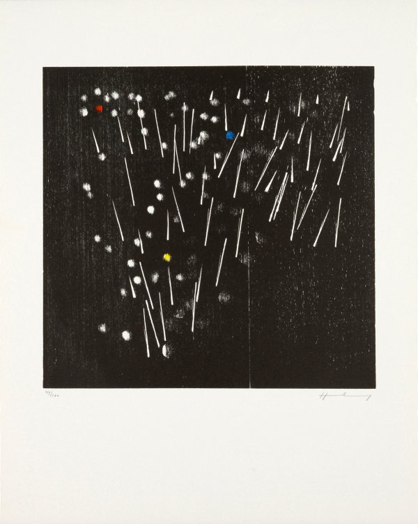 Holzschnitt mit Farb-Pochoir (Stencil)/BFK Rives Velin (Wasserzeichen), 1973. Sign. und nummeriert 44/100. Gedruckt von der Erker-Presse, St. Gallen (Blindstempel). Darstellung 40 cm x 40 cm. Blatt 65 cm x 50,3 cm.