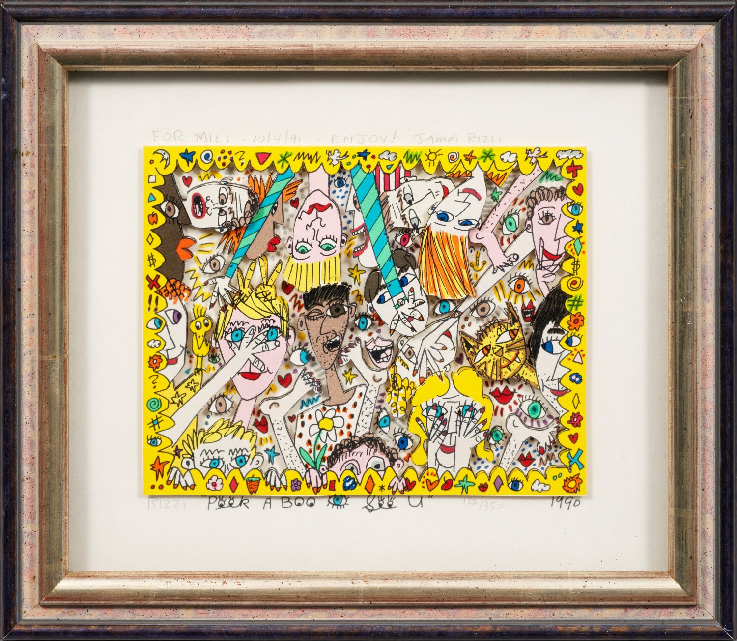 Farbserigraphie mit 3D-Konstruktion/leichter Karton, 1990. Sign., nummeriert 122/350, mit persönlicher Widmung des Künstlers, dat. 10/4/(19)91. Im Druck betitelt u. dat. 1990. Verso Einladungskarte der Galerie Jaeschke für die Vernissage der Ausstellung "New York - The American way of Life - James Rizzi" vom 11. April bis 25. Mai 1991. Darstellung 16,6 cm x 20 cm. Rahmen.