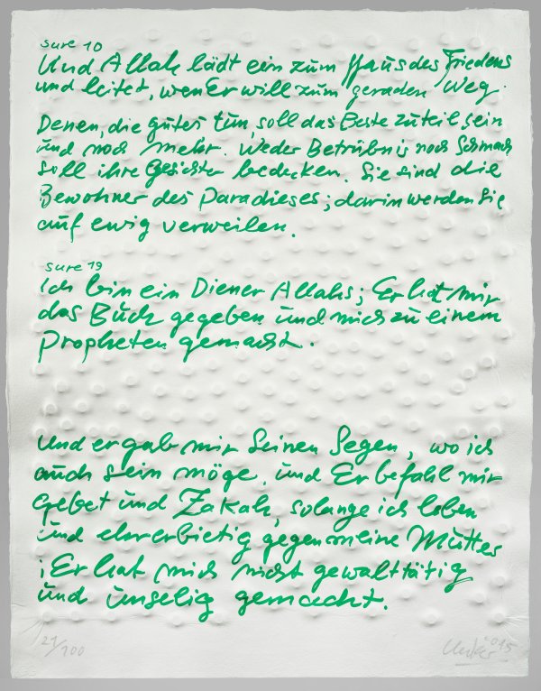 Screenprint in green and embossing on laid paper, 2015. Hand-signed, dated 2015 and numbered 21/100. Publisher's blindstamp. Plate 8 of the 9-part portfolio "Friedensgebote" (peace commandments), published in an edition of 100 + XXV + E.A. copies by Geuer & Geuer Art, Düsseldorf.