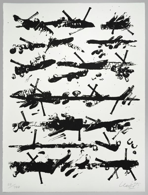 In dem Mappenwerk "Friedensgebote" setzt sich Uecker mit dem Thema der Weltreligionen auseinander und widmet sich in jedem Blatt einer spezifischen Schlüsselszene oder Textstelle aus der Bibel, der Tora oder dem Koran. Getreu seinem unverkennbaren, künstlerischen Stil arbeitet Uecker hier mit den für ihn signifikanten Materialien - Nägel, Sand und Farbe. In dem vorliegenden Blatt thematisiert der ZERO-Künstler die Passion Christi. Durch gekreuzte Nägelprofile als Metapher für die Kreuzigung und den schwarzen Fingerabdrücken des Künstlers, stellvertretend für das Blut Christi, wird das Martyrium, das Gottes Sohn erleiden musste, versinnbildlicht.