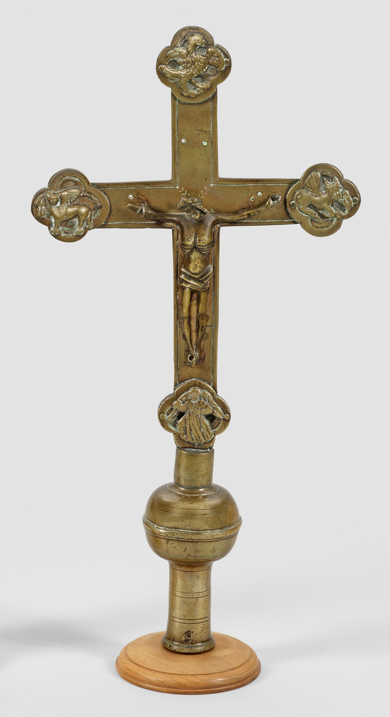 Bronze. Über profiliertem Stab mit rundem Baluster der schauseitig plastisch ausgearbeitete Corpus Christi an einem Kreuz. Die Attribute der vier Evangelisten in vierpassigen Kartuschen an den Balkenenden. Holzsockel ergänzt. Besch.; rest.; H. 52 cm.