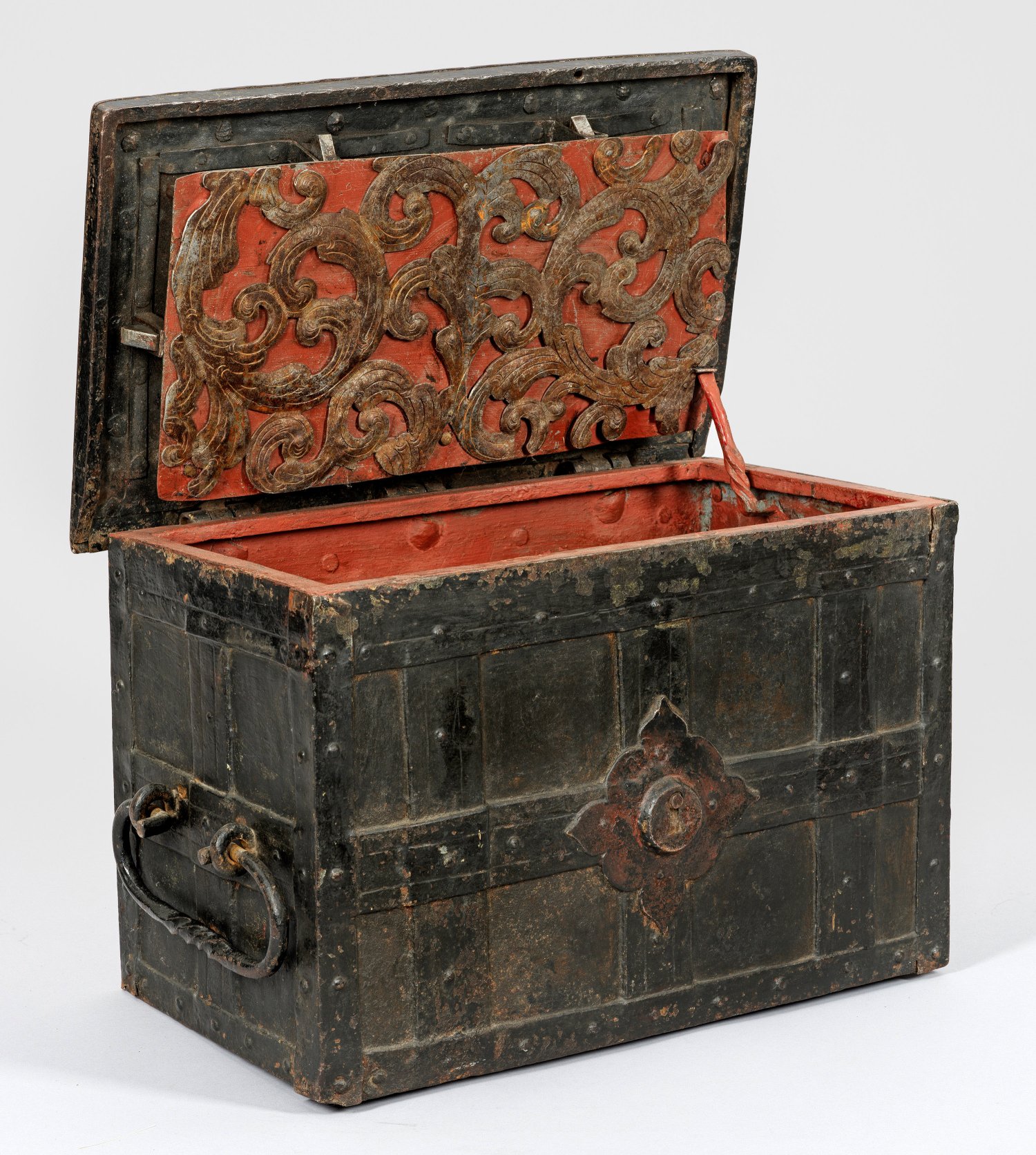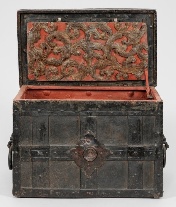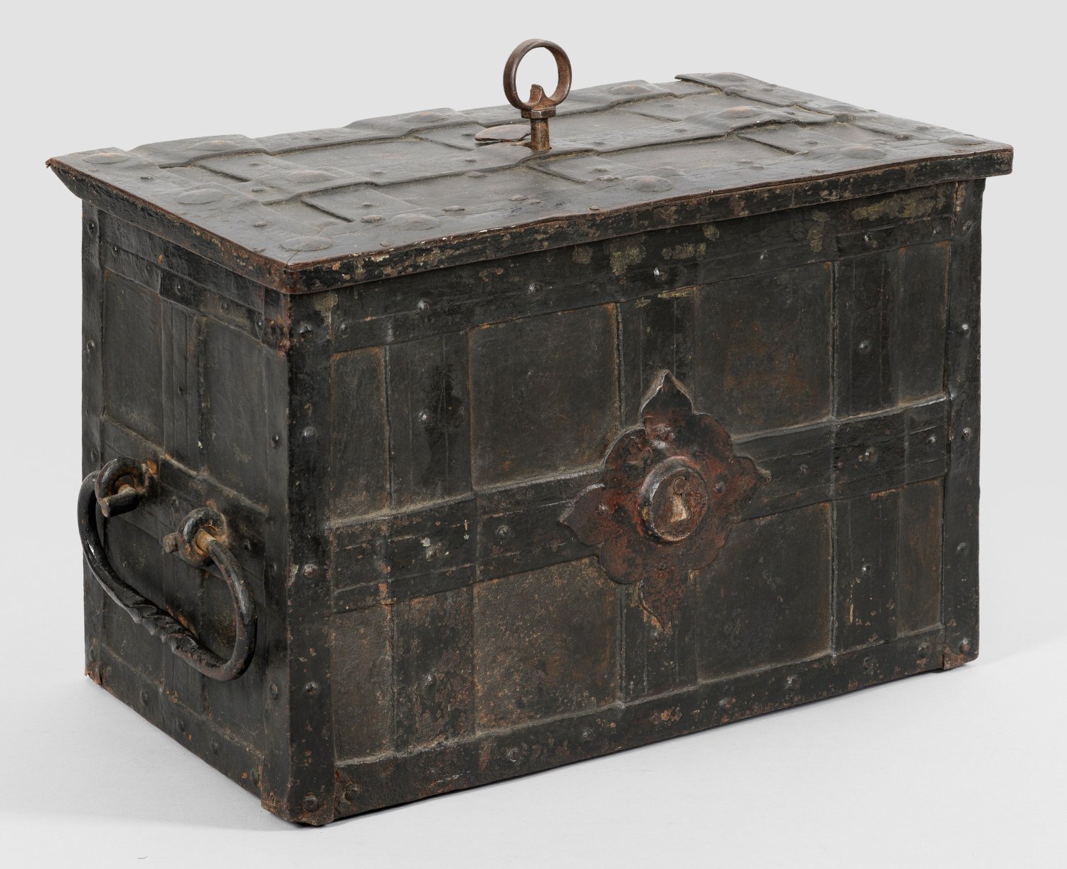 Eisen. Rechteckiger Korpus mit flachem Scharnierdeckel und seitlichen Handhaben. Korpus und Deckel mit über Kreuz vernieteten Bandbeschlägen. Frontseitig aufgelegtes Kartuschenmotiv mit Scheinschloss. Zentrales Schloss auf dem Deckel. Rot gefasste Innenwandung. Auf der Deckelinnenseite durchbrochen gearbeitete Schlossabdeckung mit ziseliertem und volutiertem Blattrankendekor sowie vier Zuhaltungen. H. 31,5 cm. 50 cm x 28,5 cm.