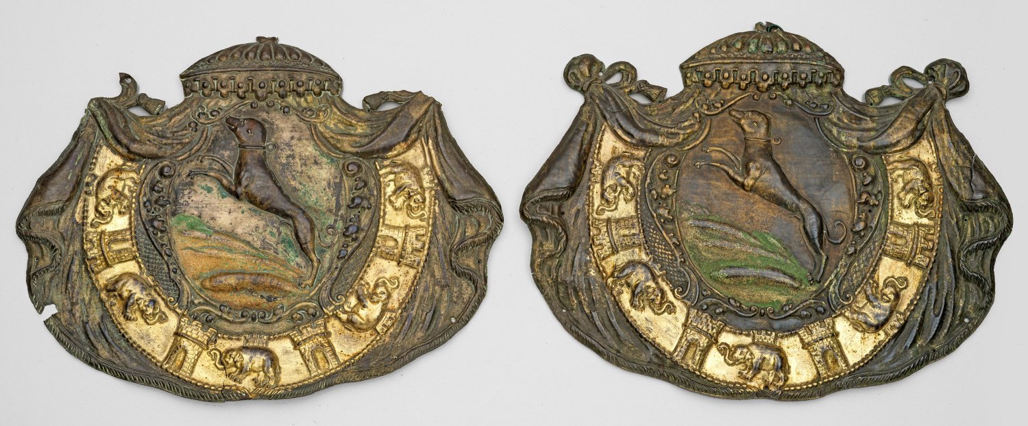 A pair of German parcel-gilt copper carriage fittings with the coat of arms of the noble family von Passow and chain of the Danish Order of the Elephant. Damaged.